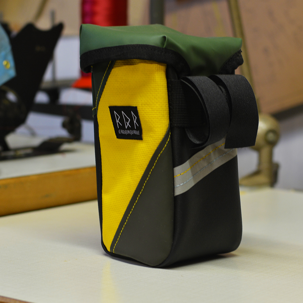 Toutes les sacoches sont cousues en Bretagne à partir de chutes de tissus et matériaux techniques récupérés. Il s’agit d’un travail artisanal dans un état d’esprit d’économie circulaire afin de tendre vers le zéro déchet.