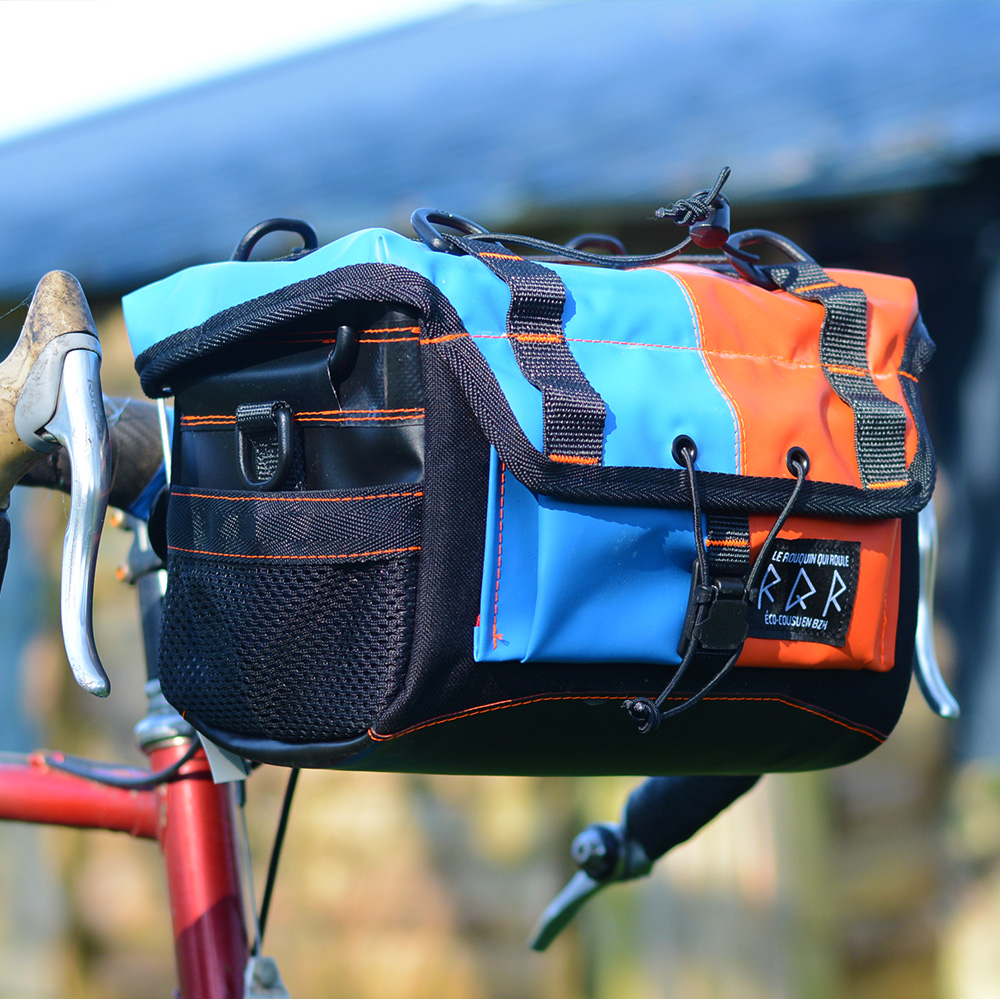 Toutes les sacoches sont cousues en centre Bretagne. Elles sont fabriquées à partir de chutes de tissus et matériaux techniques récupérés. Il s’agit d’un travail artisanal dans un état d’esprit d’économie circulaire afin de tendre vers le zéro déchet.