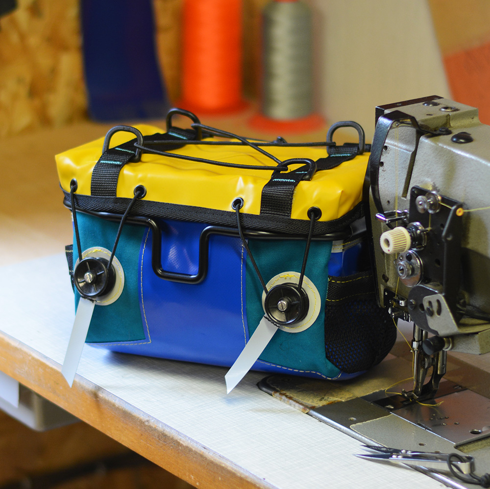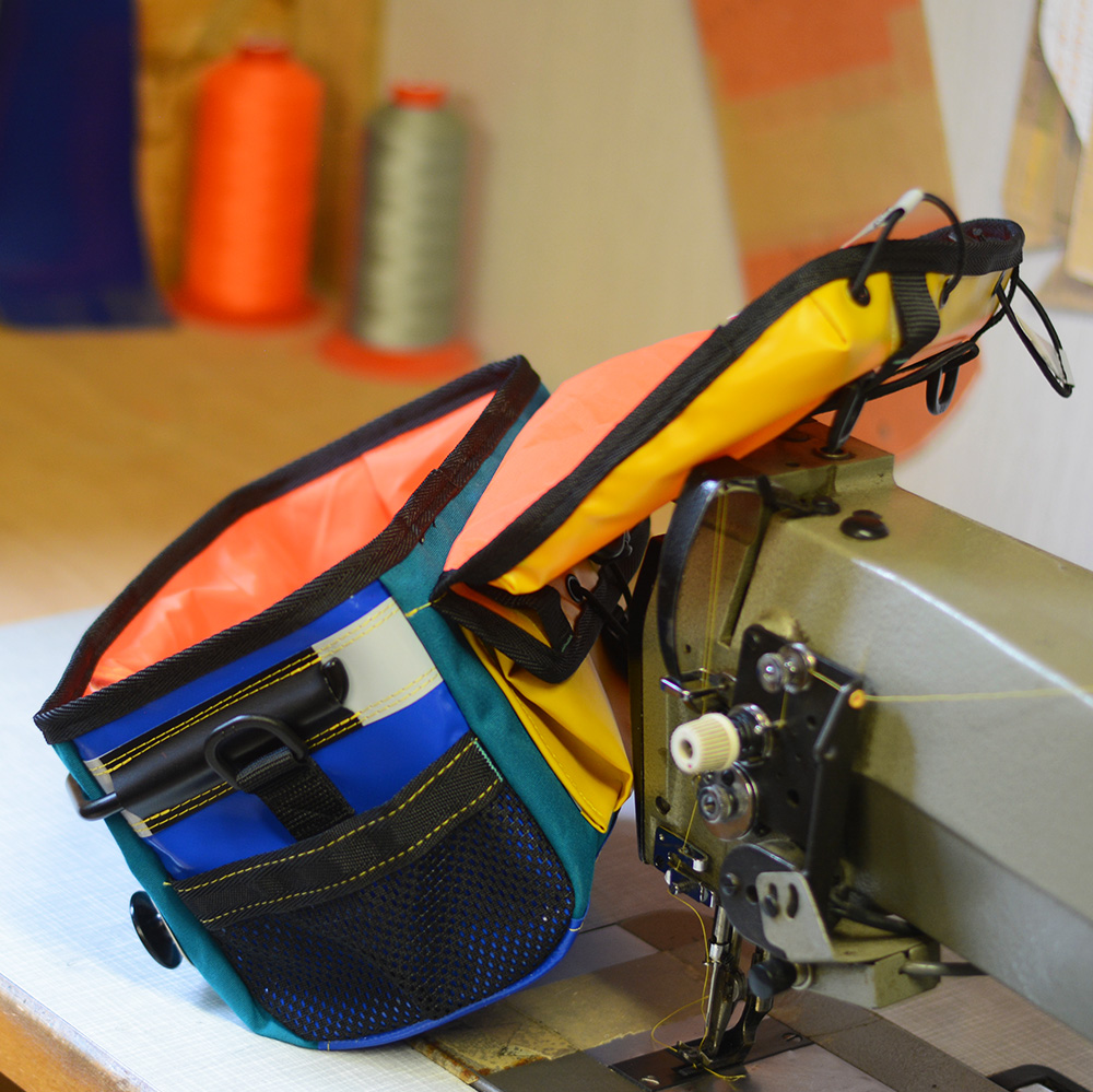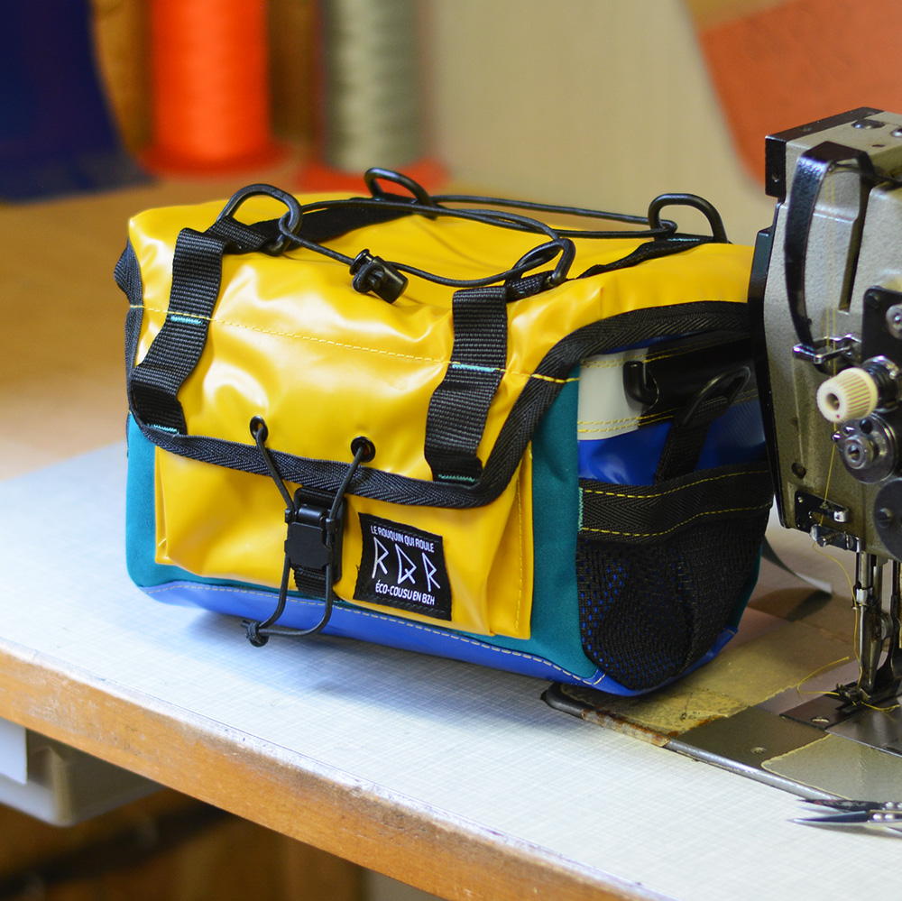 Toutes les sacoches sont cousues en centre Bretagne. Elles sont fabriquées à partir de chutes de tissus et matériaux techniques récupérés. Il s’agit d’un travail artisanal dans un état d’esprit d’économie circulaire afin de tendre vers le zéro déchet.