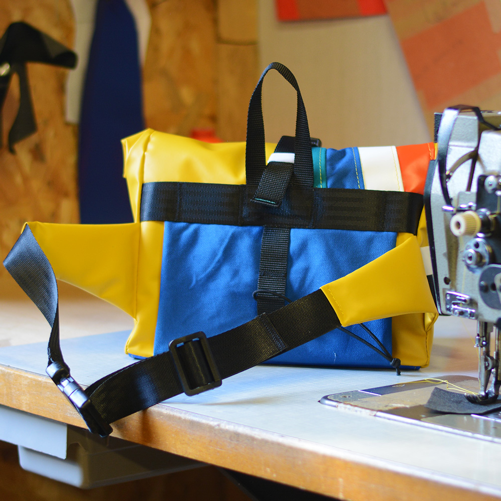 Toutes les sacoches sont cousues en Bretagne à partir de chutes de tissus et matériaux techniques récupérés. Il s’agit d’un travail artisanal dans un état d’esprit d’économie circulaire afin de tendre vers le zéro déchet.