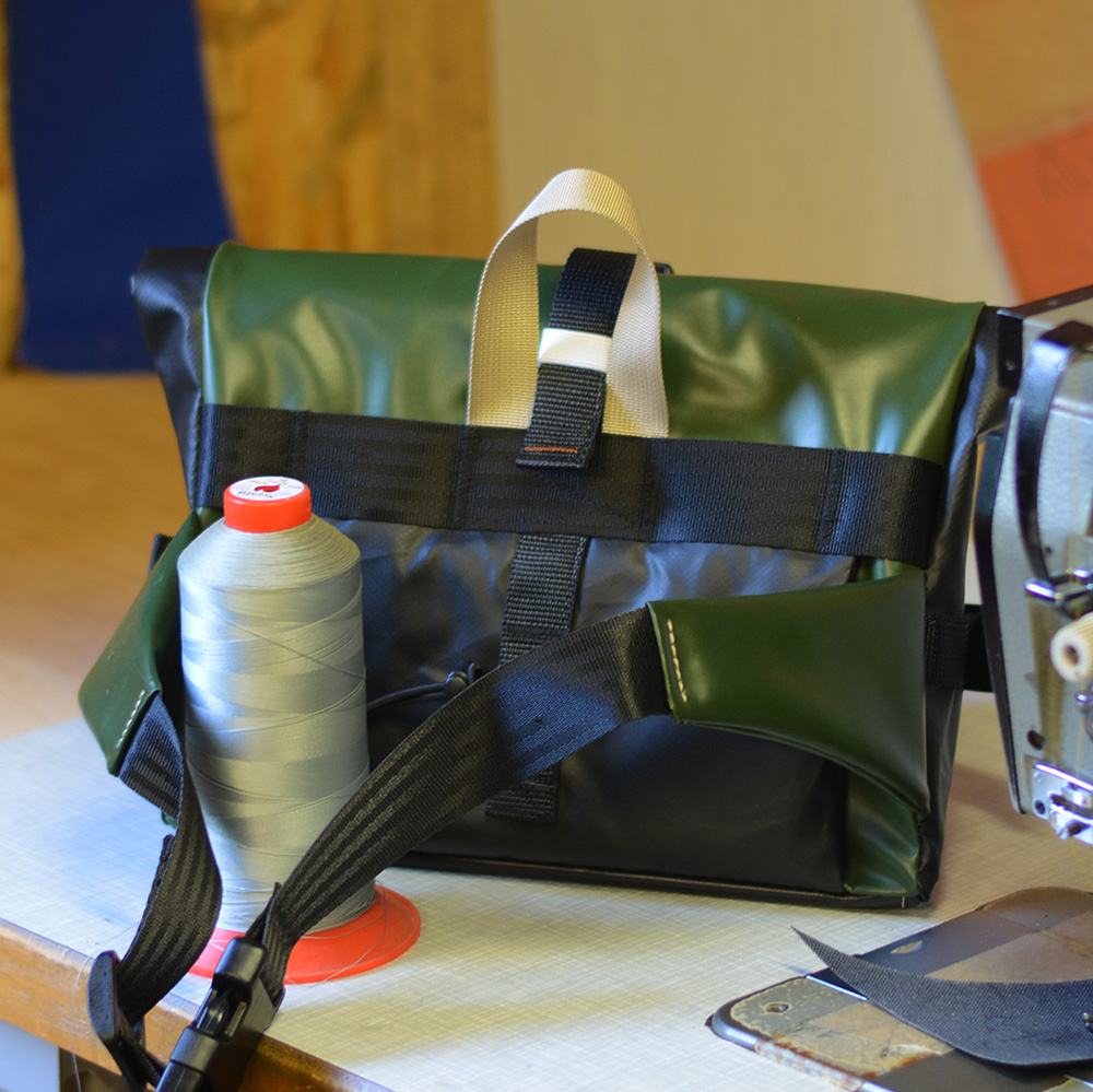 Toutes les sacoches sont cousues en Bretagne à partir de chutes de tissus et matériaux techniques récupérés. Il s’agit d’un travail artisanal dans un état d’esprit d’économie circulaire afin de tendre vers le zéro déchet.