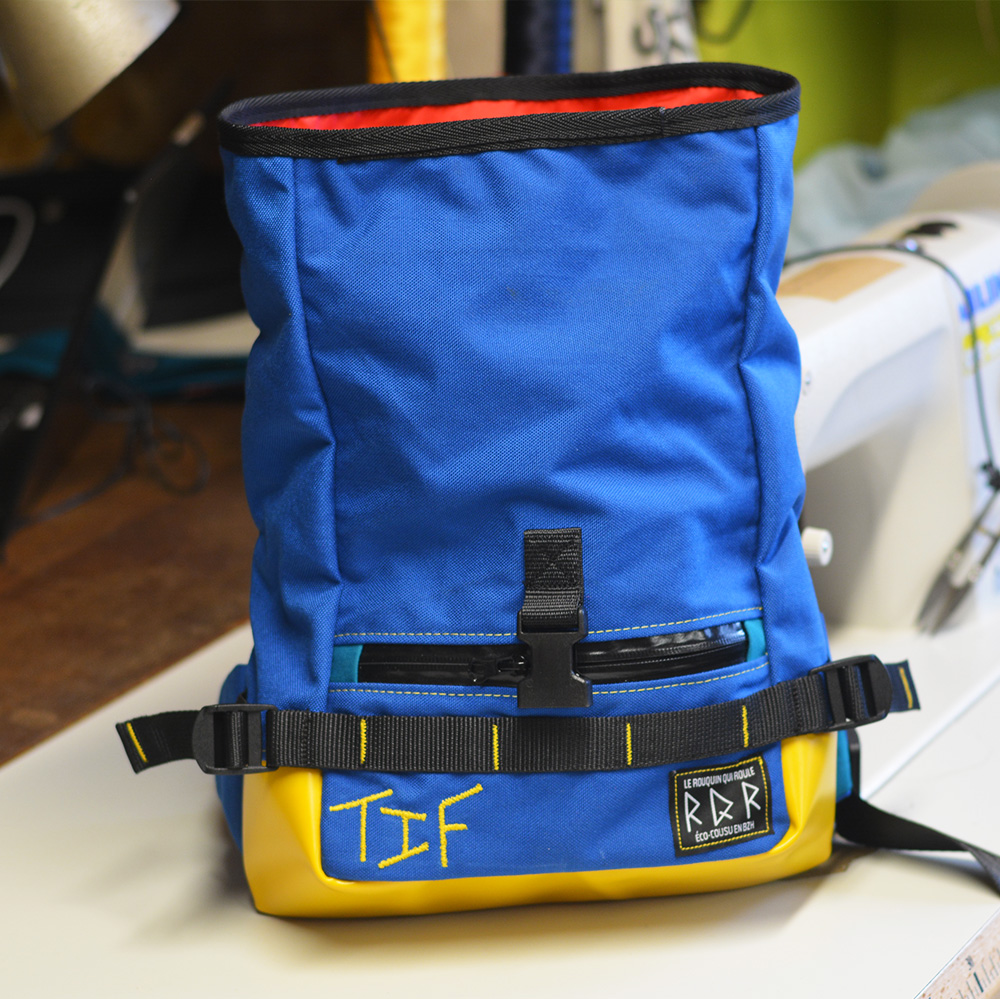 Toutes les sacoches sont cousues en Bretagne à partir de chutes de tissus et matériaux techniques récupérés. Il s’agit d’un travail artisanal dans un état d’esprit d’économie circulaire afin de tendre vers le zéro déchet.