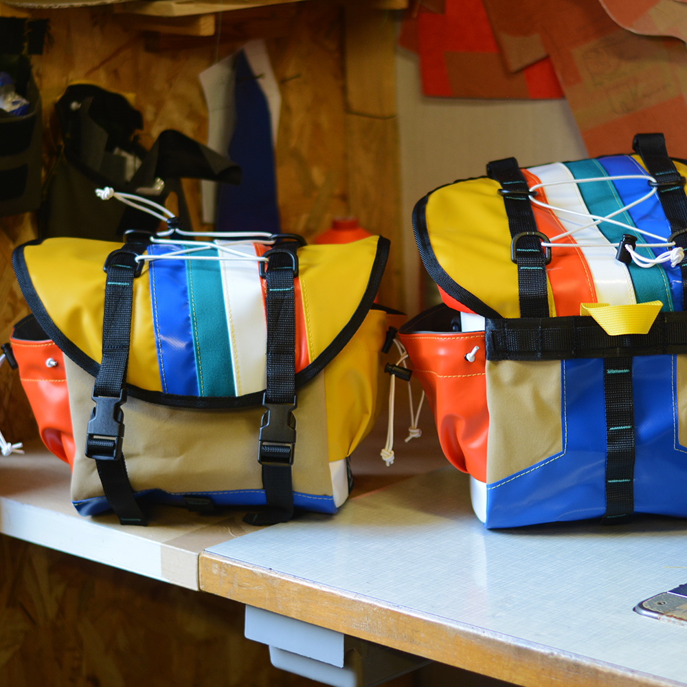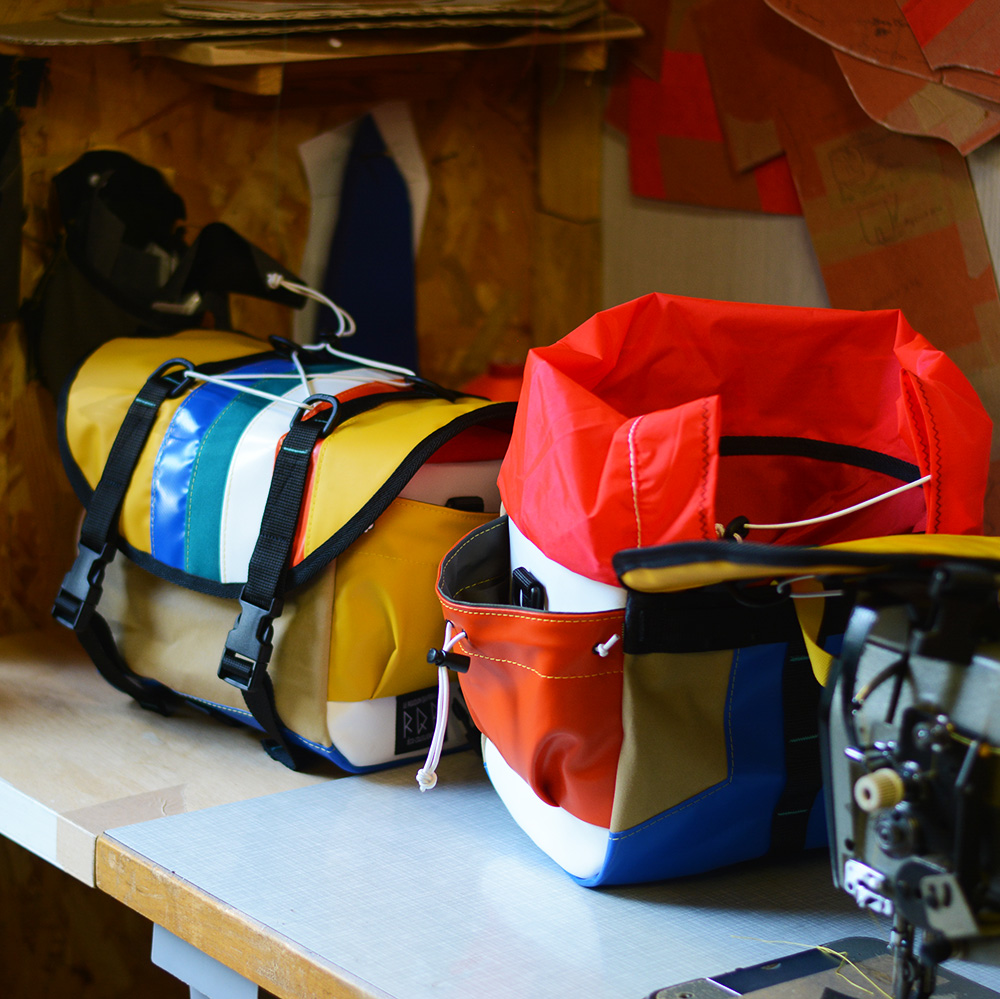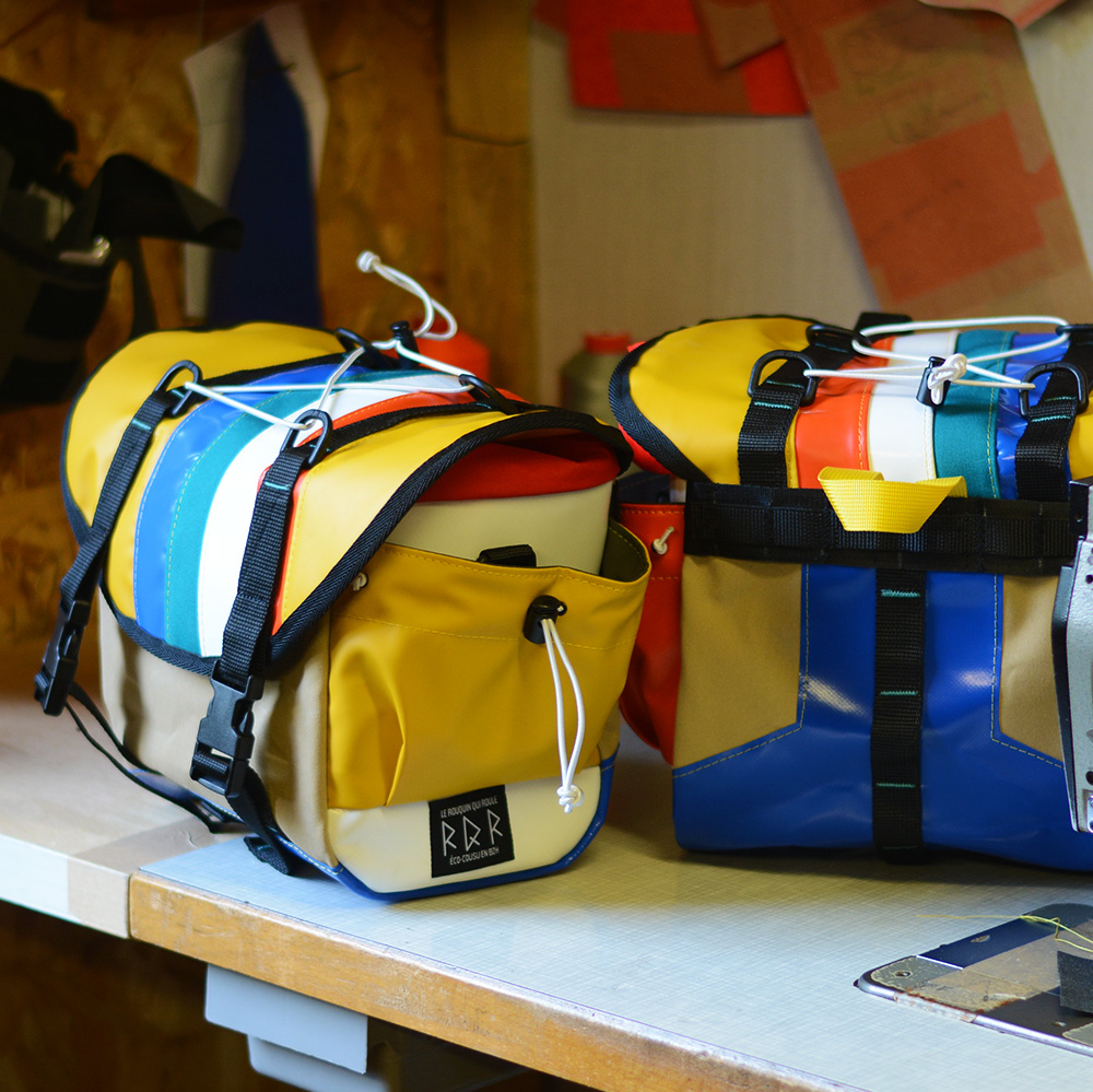 Toutes les sacoches sont cousues en centre Bretagne. Elles sont fabriquées à partir de chutes de tissus et matériaux techniques récupérés. Il s’agit d’un travail artisanal dans un état d’esprit d’économie circulaire afin de tendre vers le zéro déchet.