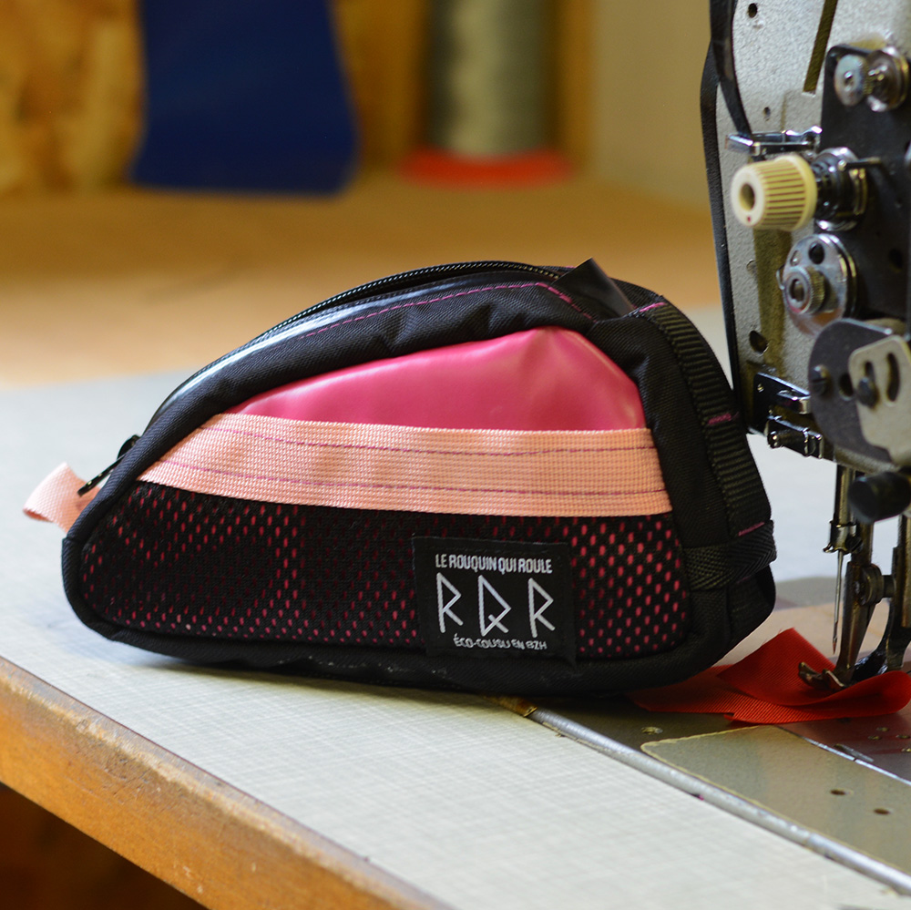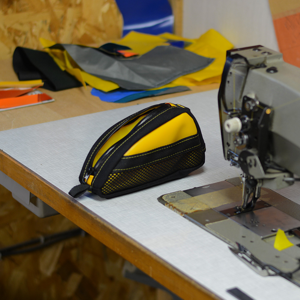 Toutes les sacoches sont cousues en France par le collectif. Elles sont fabriquées à partir de chutes de tissus et matériaux techniques récupérés. Il s’agit d’un travail artisanal dans un état d’esprit d’économie circulaire afin de tendre vers le zéro déchet.
