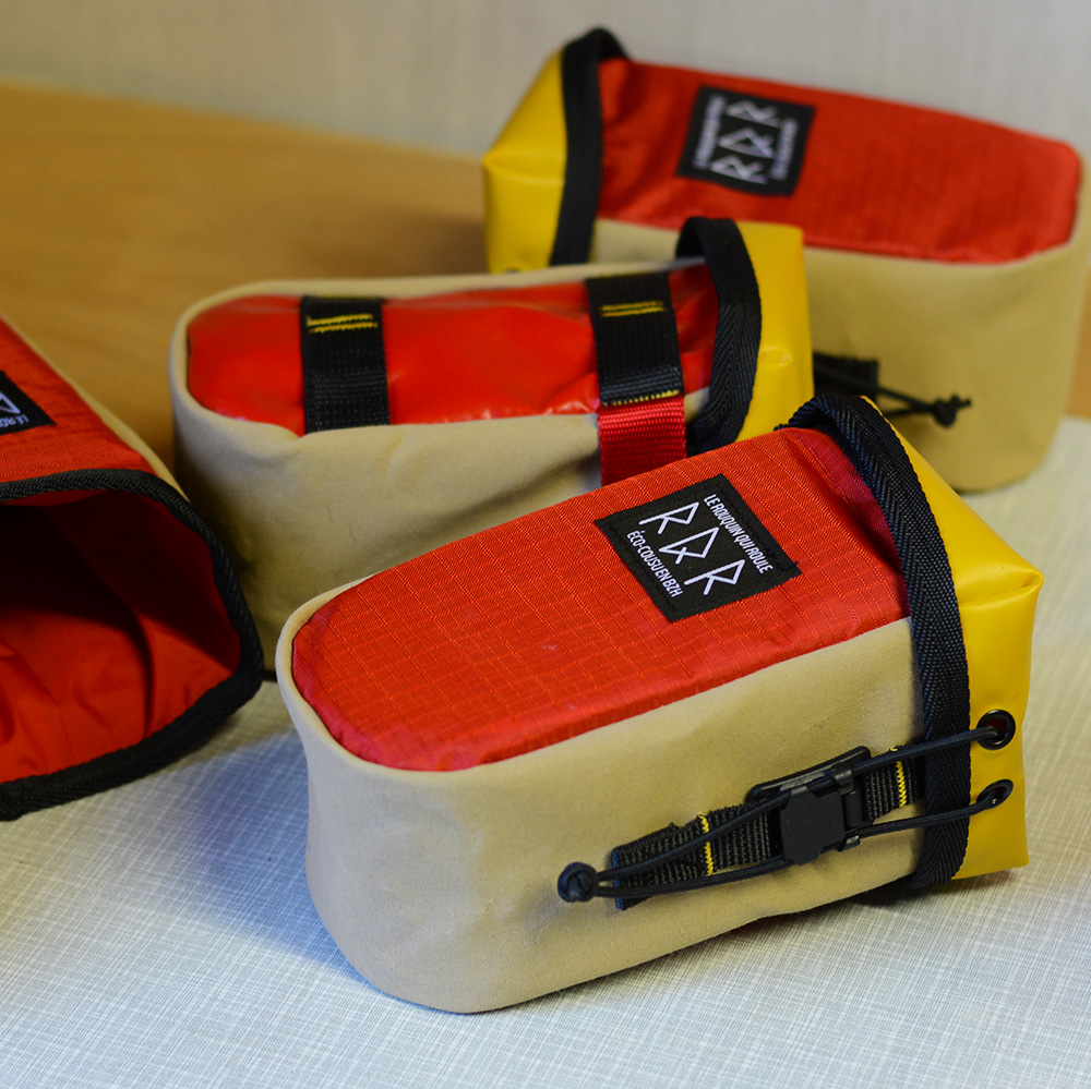 Ces sacoches étanches sont des créations originales cousues dans mon atelier en Centre Bretagne. Elles sont conçues à partir de matériaux techniques issus de l’économie circulaire.